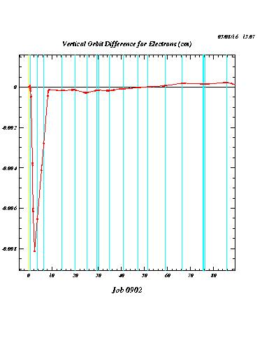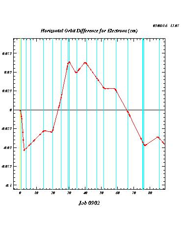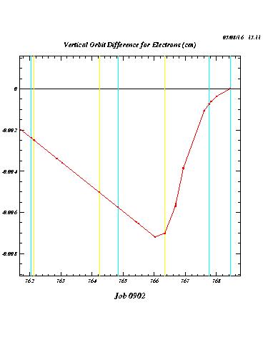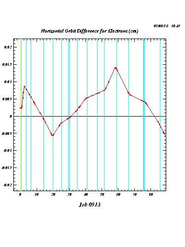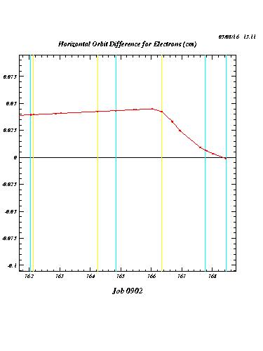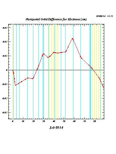 The following plots compare the calculated orbit deformations (i.e. the orbit differences with and without positron current) for three cases: