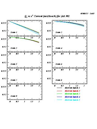 The last plot shows that the tunes were not held constant as a function of positron current in the calculation, and the 2 mA of positron bunch current resulted in a tune shift of about 3 kHz.