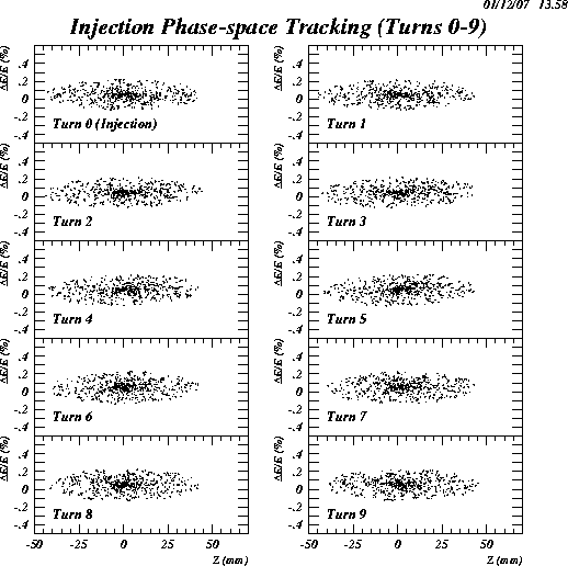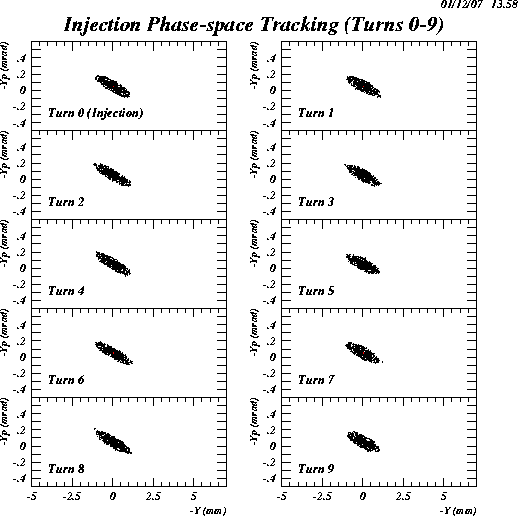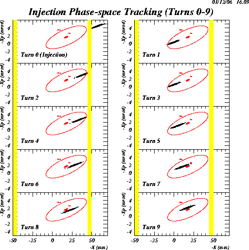 The simulation appears include the effect of the injected bunch merging with the stored beam over the first nine turns in horizontal phase space.