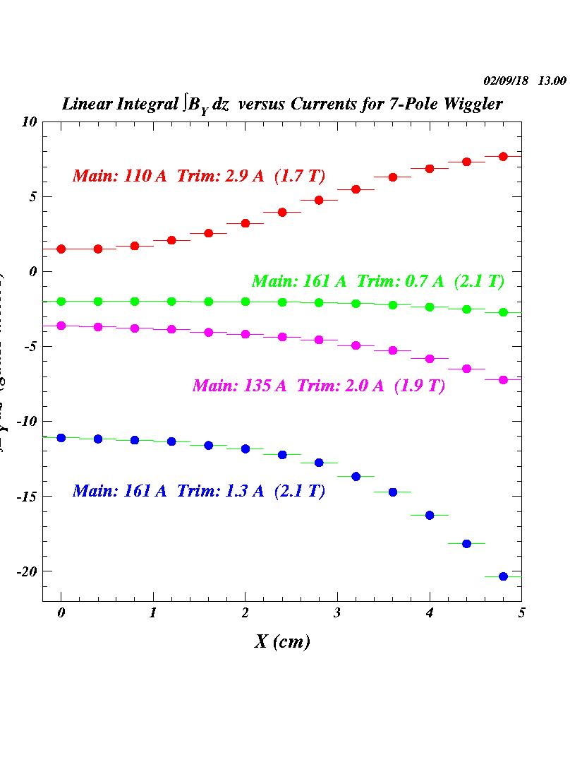 Linear integral of BY for 1.7 T, 1.9 T and 2.1 T. Adjustment of the trim coil current can give an integral for 2.1 T which is even