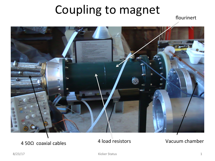 The load resistors inside the canister are cooled by fluorinert. The high voltage ceramic feedthrough (not visible in this picture) couples the load resistors to the kicker plates.