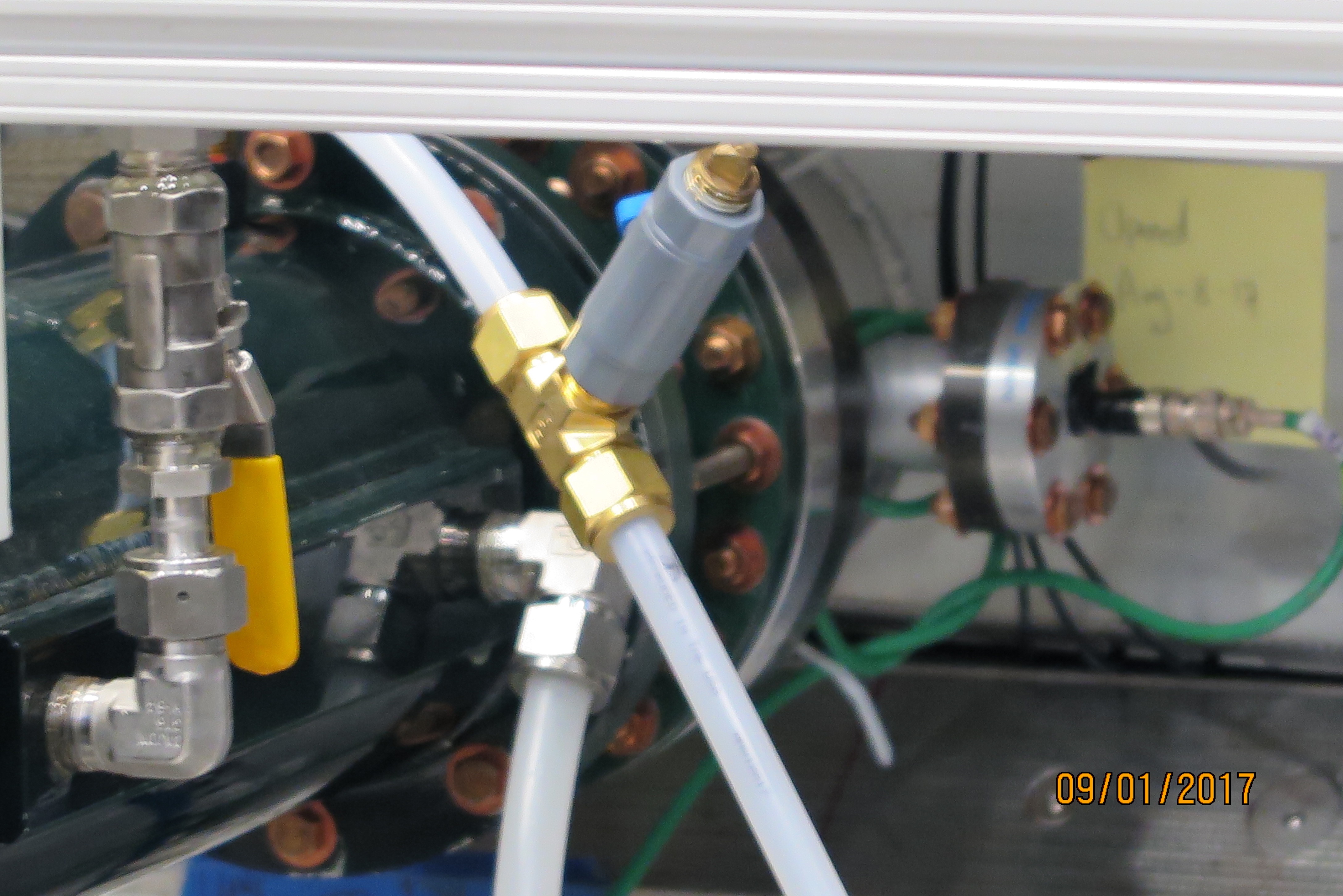 The 'bazooka' canister is attached to the vacuum chamber. It accepts four parallel 50 Ohm coaxial cables that extend from the end of the