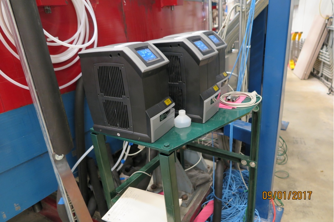 Fig. 9 Fluorinert pumps, one for each of 3 bazookas outside the ring. Note that if the pumps are too close to the magnet the temperature and flow monitoring will fault. If the level of fluorinert in the bazookas drops below the resistors there will be internal sparking that can damage resistors.