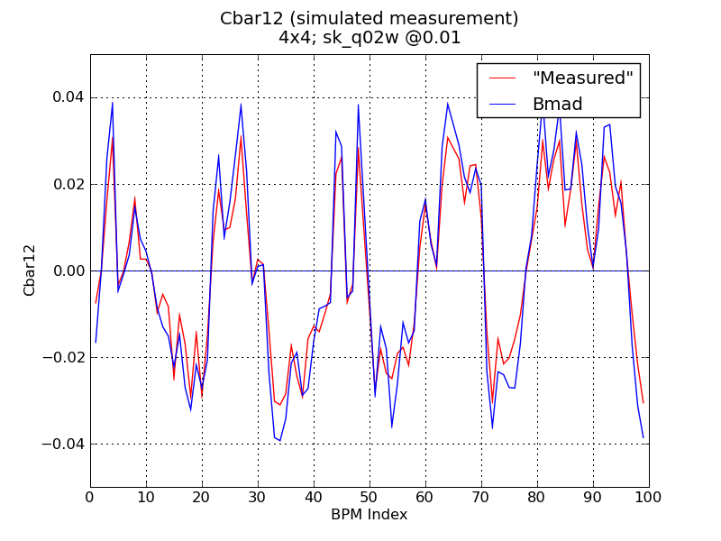 Similar to previous studies in Cbar measurement simulation, now turn on radiation damping and RF cavities. Instead of off setting the initial coordinate of the particle, now we resonantly excite at the a- and b-mode tunes. For the purposes of this exercise, take the origins of shaking to be at H01W (element #4 in the lattice) and V02W (element #43). Damp for 60k turns and record 1024 turns. Start with an ideal lattice (cta_2085mev_20090516.lat; no errors or resolution, w/ sk_q02W @0.01) and look at the difference between "measured" and Bmad model Cbar values.