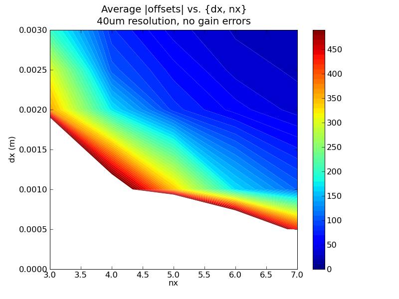 Note that we are ignoring actual gain errors at this point. Consider the ideal scenario where gains == 1 and offsets == 0. Every resolution uses the same scales for the three plots.