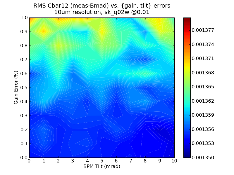 Make contour plots for each type of measurement as a function of RMS applied BPM tilts and gain errors. Repeat for resolutions of [0,10,35] microns.