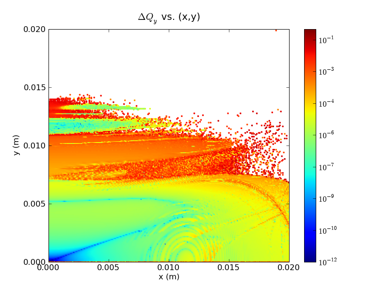 Full frequency map over 0-20mm in x and y, tracking 4096 turns and using fft_turns = 512.