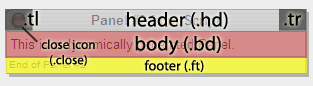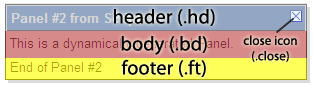 The Panel, like all other YUI Container controls, has a header, body, and footer. In addition, the Panel also has a "close" element containing a background image to give it the appearance of a UI window close control. In this tutorial, we will manipulate the CSS styles for these elements and create several new elements to allow for additional pieces of the skin to be styled.