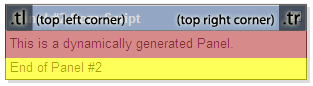 First, we will create rounded corners for our skin by applying images to the top left and top right corners of the Panel header. All of our CSS styles are applied to this Panel instance using ID selectors. In this case, the Panel's ID will be "myPanel", so all styles will begin with "#myPanel". In order to facilitate the creation of these corners, we will create two new empty div